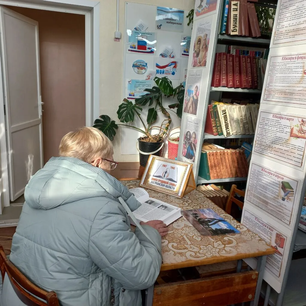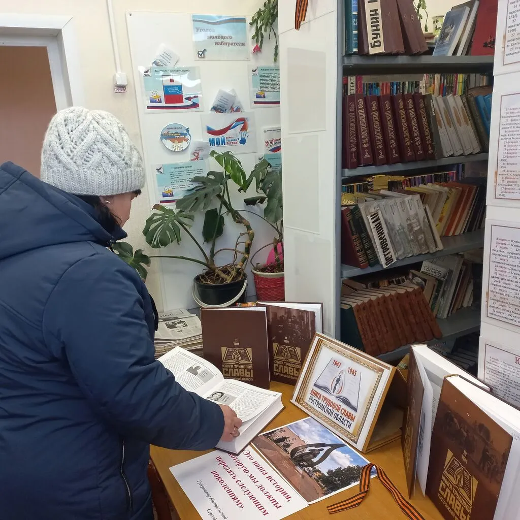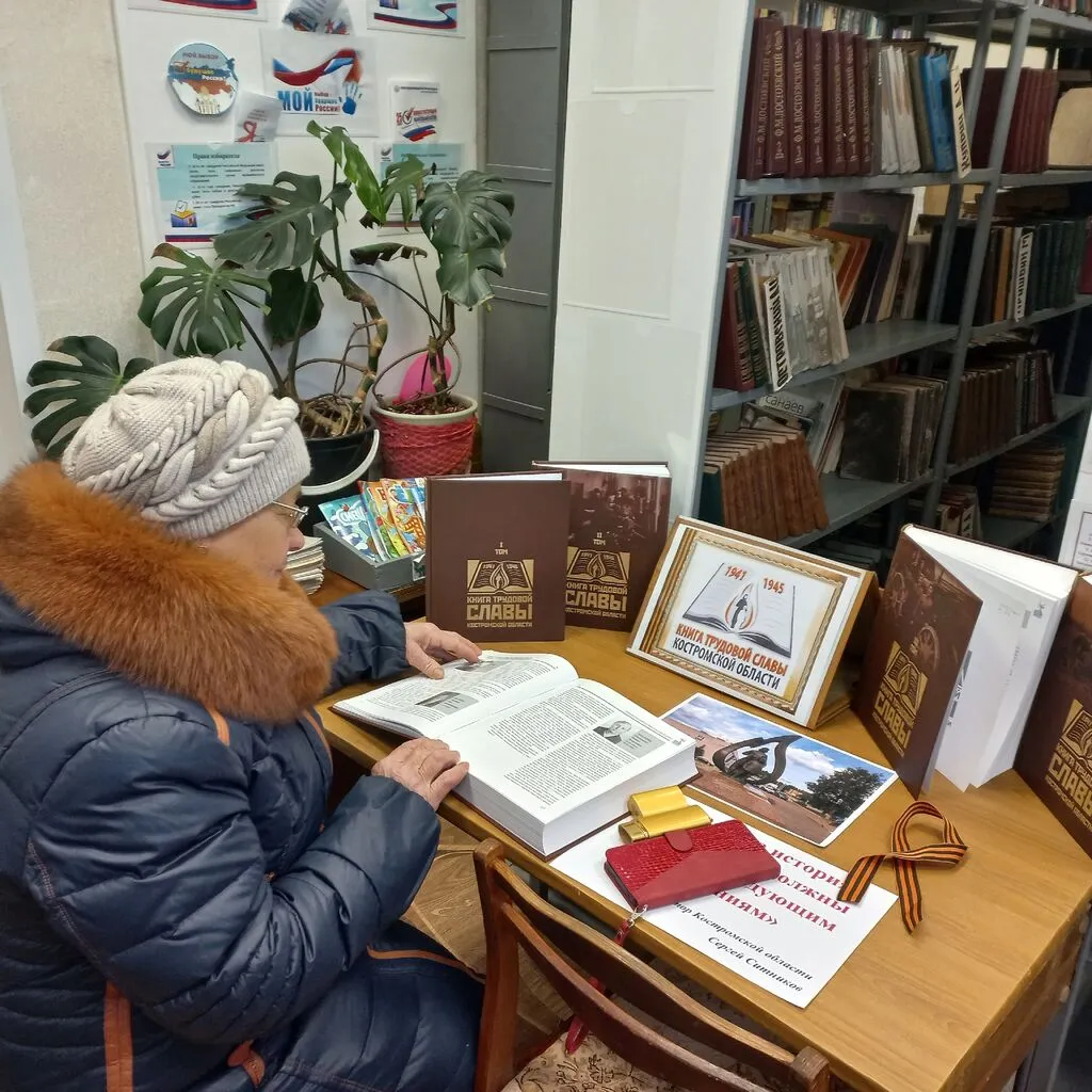 В библиотеке оформлена выставка - знакомство «Книга трудовой славы Костромской области» в пяти томах. У выставки проходят мини – беседы о наших земляках, героях этих книг. Освещение на странице библиотеки появления этих книг в фонде библиотеки привело к большому интересу среди жителей нашего поселка. Особенно тех, чьи родственники, будучи детьми, работали в годы ВОВ и помогали фронту. Люди приходят, читают о родственниках и радуются, что их имена останутся в памяти потомков.